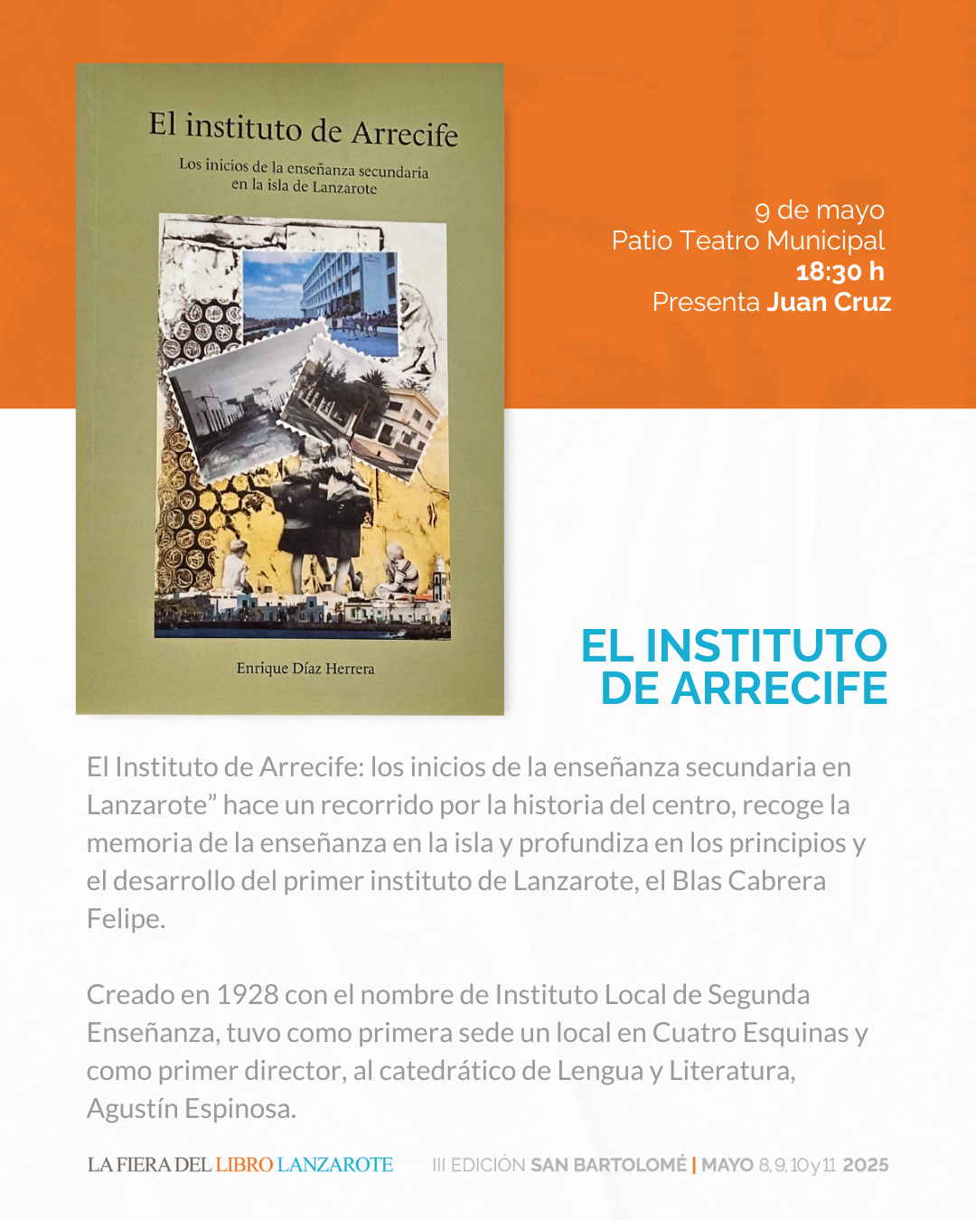 Nos complace anunciar que dentro de la programación de la Fiera del Libro contaremos con la presentación del libro El Instituto de Arrecife, una obra que nos invita a conocer más de cerca la historia y vivencias ligadas a uno de los centros educativos más emblemáticos de la isla: el Blas Cabrera Felipe.